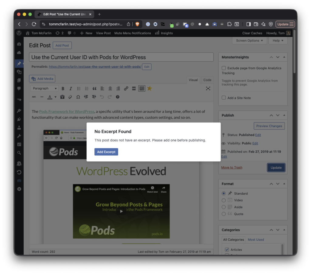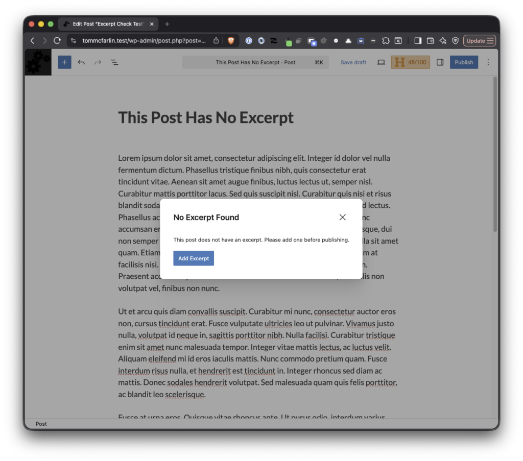 Remind mode is the default. The modal appears, the author sees the prompt, and they choose whether to add an excerpt or continue without one. Nothing is blocked. It’s a nudge, not a gate.