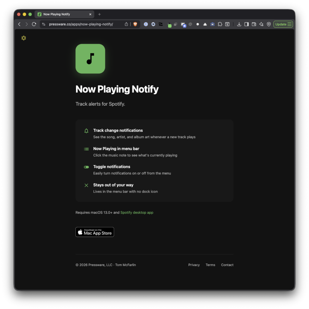 Version 1.0 handles the core use case: notifications when tracks change. I have ideas for future updates such as playback controls in the menu bar, the ability to skip or pause from a notification, maybe a start-at-login toggle. But those will come incrementally, if and when I find the time to implement them.