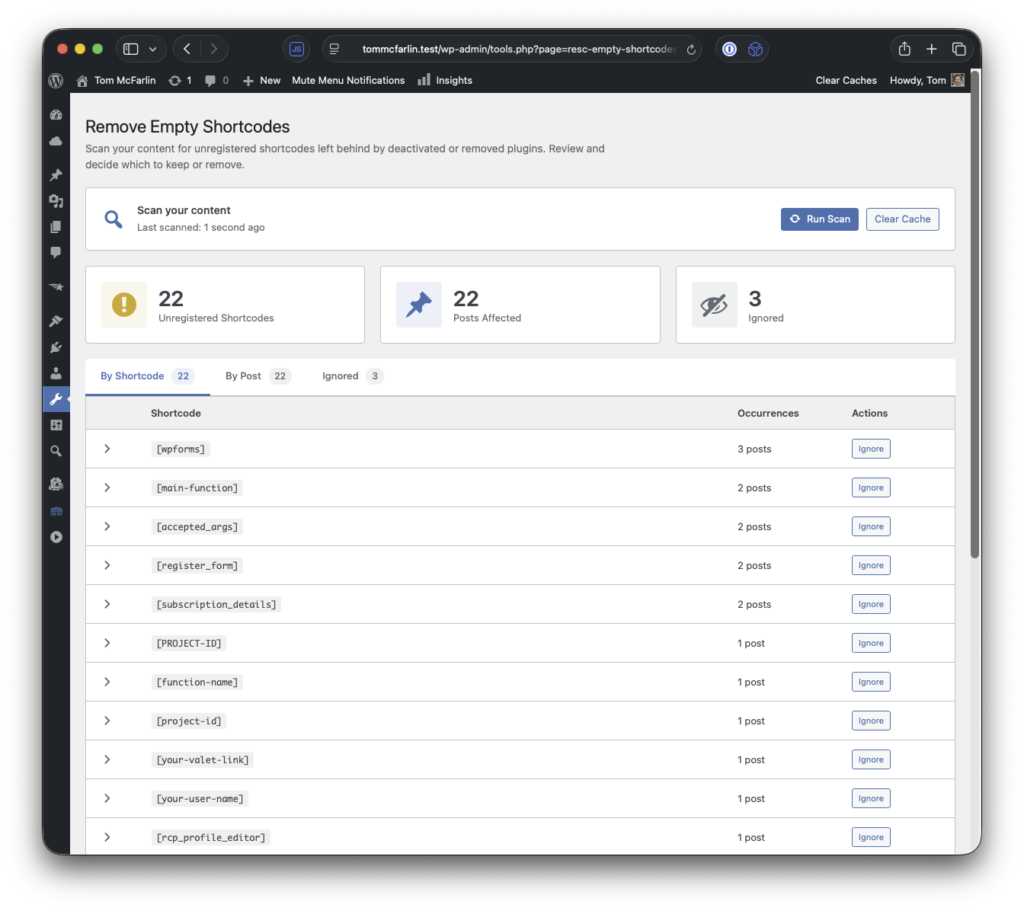 The scanner includes an Ignore action for each shortcode. Ignored shortcodes won’t be flagged in future scans, and the automatic removal feature will leave them alone.