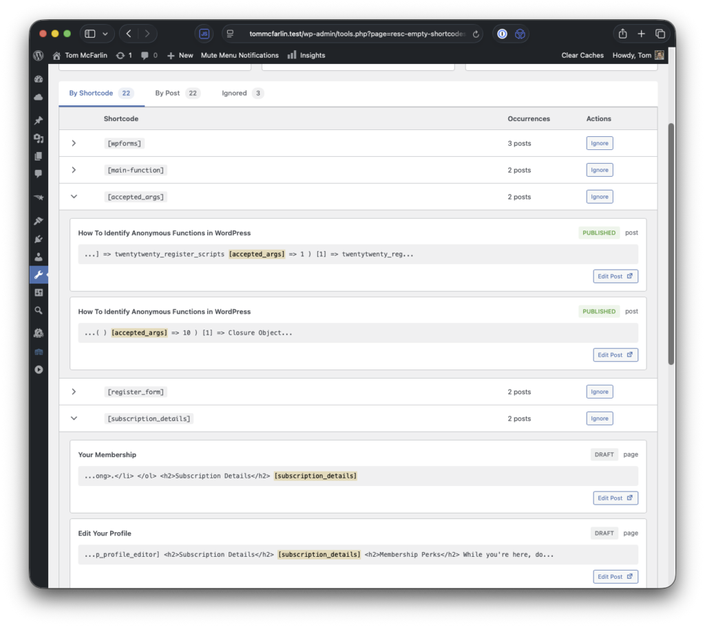 There are two views: By Shortcode (grouped by shortcode name) and By Post (grouped by affected content). You can expand any row to see the full context and jump directly to the post editor.