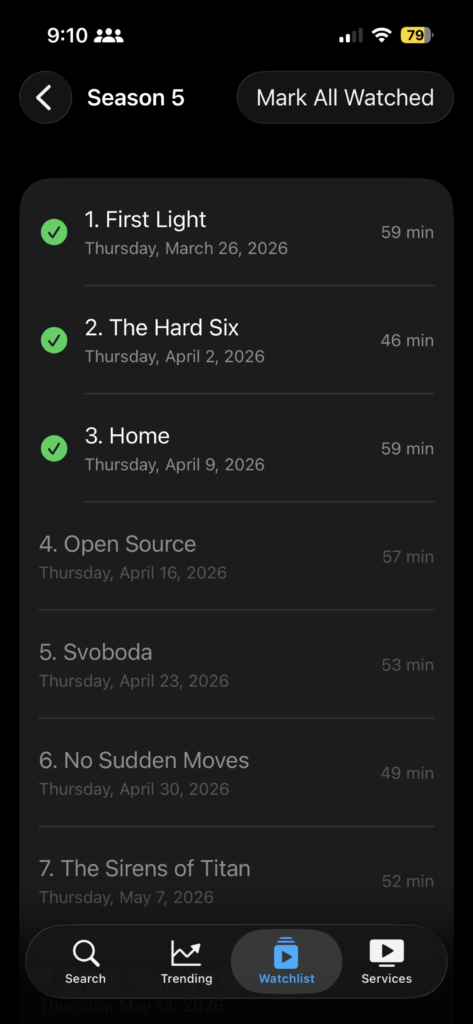 Tap into a season and you get the full episode list: name, air date, runtime, and a watched toggle. Mark episodes individually or hit “Mark All Watched” at the top if you’ve already binged the whole thing.